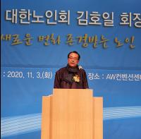 대한노인회 법정단체화, 노인건강증진센터 건립 추진 약속대학원·노인방송국·연구원 등 설립해 자립 기반 만들 것제18대 대한노인회 김호일 회장 취임식이 11월 3일 오전 11시 서울 종로구 소재 AW컨벤션…