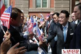 [워싱턴=노년신문] 성수목 기자 = 윤석열 대통령이 24일(현지시간) 워싱턴에 위치한 미국 영빈관 '블레어하우스'에 도착해 교민들과 인사하고 있다. (공동취재) 2023.04.25.[워싱턴=뉴시스] 박미영 김지훈 …