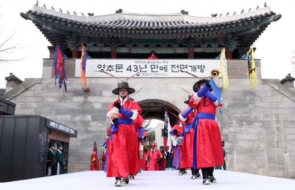 경복궁 서문인 영추문(迎秋門)이 복원 43년 만에 활짝 열렸다.