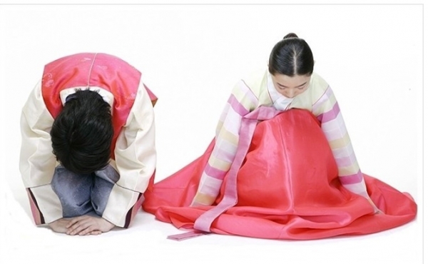 4. 윗몸을 45도 앞으로 반쯤 구부려 절한다.