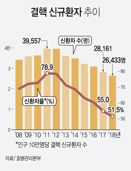 우리나라 결핵 신규환자는 2011년 최고치(3만9천557명) 이후 7년 연속 감소하고 있지만, 경제협력개발기구(OECD) 회원국 중 결핵 발생률은 가장 높다.