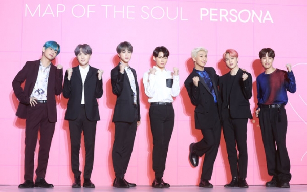 그룹 방탄소년단(BTS)이 지난달 17일 오전 서울 중구 을지로 동대문디자인플라자에서 새 미니앨범 ‘맵 오브 더 솔 : 페르소나(Map of the soul: Persona)'’ 발매 기자간담회를 열고 포즈를 취하고 있다. 왼쪽부터 뷔, 슈가, 진, 정국, RM, 지민, 제이홉.