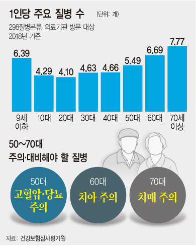 7일 건강보험심사평가원이 어버이날(5월8일)을 맞아 발표한 질병 분석 결과를 보면 50대 이상 환자들은 지난해 1인당 6.68개 질병으로 병원을 방문했다. 연령별 1인당 주요 질병 개수는 70세 이상이 7.77개로 가장 많았고 60대 6.69개, 50대 5.49개 순이었다.