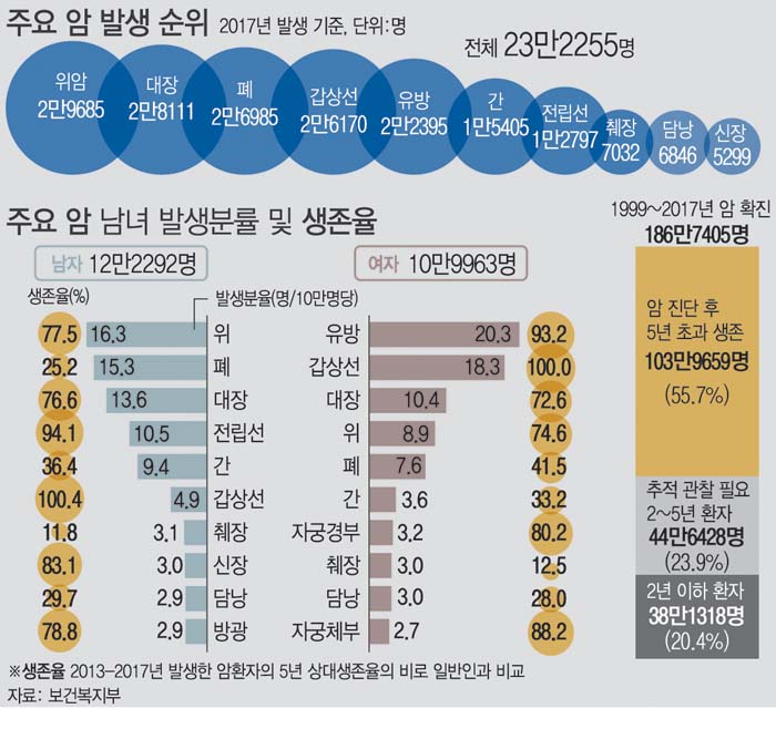 2017년 한 해 새로 발생한 암 환자는 남자 12만2292명, 여자 10만9963명 등 총 23만2255명으로 집계됐다. 2016년 23만1236명 대비 1019명(0.4%) 증가했다.