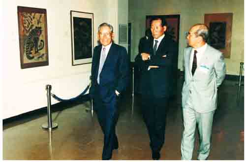 | 1983년 故 이병철(왼쪽) 삼성그룹 회장, 故 정주영 현대 회장, 故 박태준 포항제철 회장. 서울의 한 미술전시회장을 둘러보고 있다. |