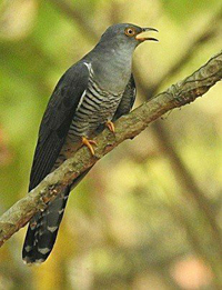 뻐꾸기는 보통 2 음절로 ‘뻐꾹 뻐꾹’ 하지만 검은등뻐꾸기는 ‘홀딱 벗고’라며 우는 것 처럼 들리는데 철저한 ‘4음절 4박자’에 음정은 ‘도시시솔’이다.