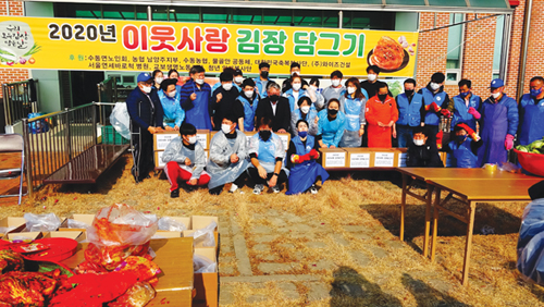 경기 남양주시지회 수동면분회(분회장 김영수)는 지난 15일 수동면 물골안 다목적회관(분회관) 2층 강당에서 반딧불이보전회(회장 이희원)와 공동 주관해 ‘2020 이웃사랑 김장김치 담그기’행사를 개최했다.