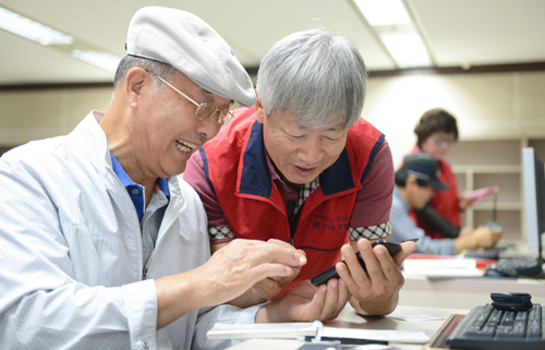 | 대전 서구가 지난 2014년 9월 구청 전산교육장에서 개설한 노인 대상 스마트폰 활용강좌에 참여한 한 노인수강생이 스마트폰을 조작하며 웃고 있다. |