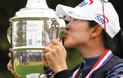 | 미 여자 프로골프(LPGA) US여자오픈에서 우승한 김아림이 14일(현지시간) 우승컵에 입맞추고 있다. 김아림은 첫 출전한 LPGA 대회에서 5타 차이를 뒤집고 역전 우승을 차지했다 |