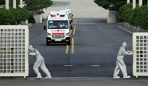 | 해외파병중코로나19가집단발병한청해부대제34진장병들이20일오후경기성남시서울공항으로도착, 앰블런스를 타고 이동하고 있다. |