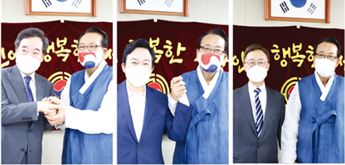 | 사진 좌로부터 이낙연 더불어민주당 대선 예비후보, 원희룡 국민의 힘 대선 예비후보는 8월 24일 각각 한노인회 김호일 대회장을 예방해 환담을 나눴으며, 최재형 국민의 힘 대선 예비후보는 그보다 앞선 8월 18일 예방했다. |