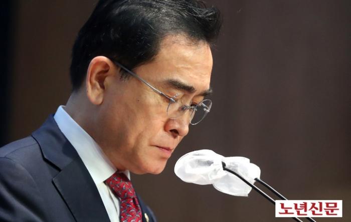 [서울=노년신문] 성수목 기자 = 태영호 국민의힘 최고위원이 10일 오전 서울 여의도 국회에서 최고위원직 사퇴 기자회견중 고개를 숙이고 있다. 2023.05.10.