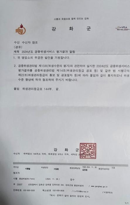 이번 위생 관리 등급 녹색 최우수등급 획득을 계기로, 석모도호텔은 더욱더 안전하고 청결한 환경을 제공하며, 고객들의 신뢰와 사랑을 받는 호텔로 자리매김할 것으로 기대된다. #석모도호텔 #석모도숙박 #강화 #석모도 #성수목호랑이교장 #위생관리등급 #녹색최우수등급 #강화군 #권태영기자 |