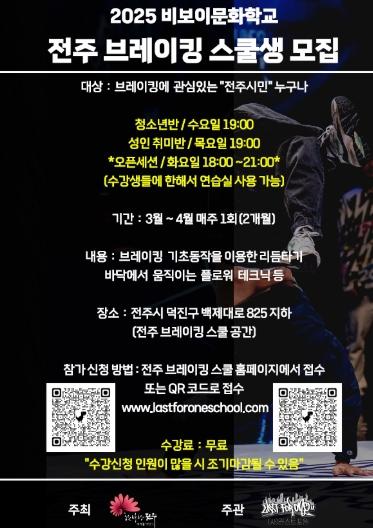 수강생 모집은 신청자가 많을 경우 조기 마감될 수 있으며, 수강 신청 및 자세한 사항은 전주브레이킹스쿨 누리집에서 확인할 수 있다.