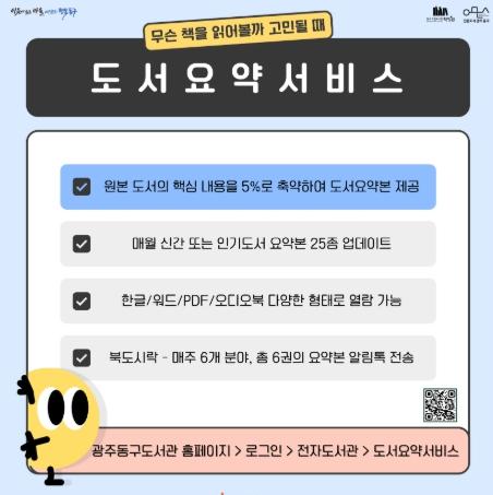 [노년신문, 성수목기자] 광주 동구는 언제 어디서든 효율적인 독서가 가능한 ‘도서 요약 서비스’ 등 독서 환경 강화를 위한 다양한 정책을 추진한다고 밝혔다.