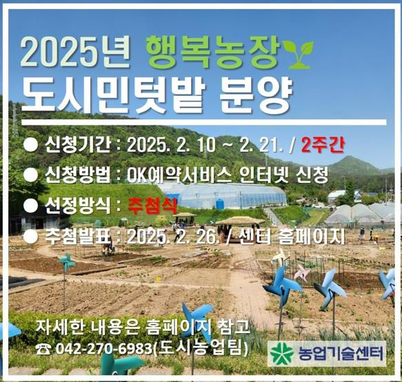 행복 농장은 대전시농업기술센터(유성구 교촌대정로 97) 내부에 위치하며, 20㎡ 45구획, 10㎡ 65구획으로 구성되어 있다.