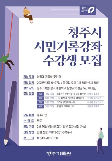 [노년신문, 성수목기자] 청주기록원은 다음달 2025 청주시 시민기록강좌 개강을 앞두고 오는 10일부터 수강생을 모집한다고 9일 밝혔다.