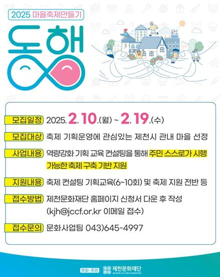 한편, 마을축제 만들기 ‘동행’사업과 관련된 자세한 내용은 제천문화재단 홈페이지 또는 문화사업팀에 문의하면 안내받을 수 있다.