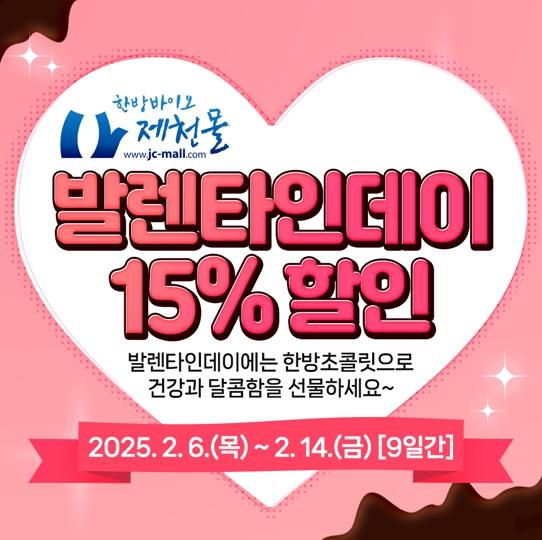 [노년신문, 성수목기자] 제천한방천연물산업진흥재단이 운영하는 한방천연물제품 전문 쇼핑몰인 ‘한방바이오제천몰’에서 발렌타인데이를 맞아 지난 6일부터 14일까지 9일간 한방초콜릿 제품을 15% 할인 판매한다고 밝혔다.