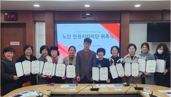 [노년신문, 성수목기자] 구미시는 지난 7일 시청 소회의실에서 노인복지에 관한 학식과 경험이 풍부한 10명을 ‘구미시 노인의료복지시설 노인 인권지킴이단’으로 위촉했다.