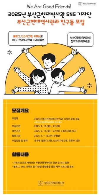 [노년신문, 성수목기자] 부산근현대역사관은 오는 17일부터 22일까지 역사관의 매력을 널리 전파할 사회관계망서비스(SNS) 기자단 '2025년 부산근현대역사관과 친구들'을 모집한다고 밝혔다.