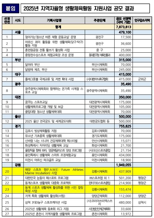 [노년신문, 성수목기자] 강릉시가 문화체육관광부가 주관하는‘2025년 지역자율형 생활체육활동 지원 공모 사업’에 선정되어 3년간 총 18억 원의 국비를 지원받게 됐다.