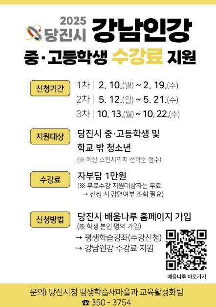 [노년신문, 성수목기자] 당진시가 사교육비로 인한 부모들의 경제적 부담을 덜어주기 위해 당진시 중·고등학생과 학교 밖 청소년을 대상으로 ‘강남인강’ 수강료를 지원한다고 10일 밝혔다.