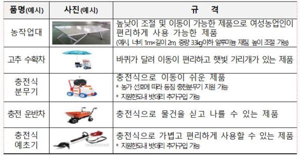 이에 지원되는 편이 장비는 ▲농작업 대 ▲충전식 분무기 ▲충전식 운반차 ▲충전식 예초기 ▲고추 수확 차 등이다.