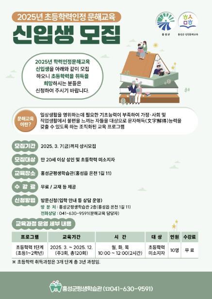 [노년신문, 성수목기자] 홍성군에서 비문해·저학력 군민을 위한 의무교육 제공과 균등한 교육기회 보장을 위하여 ‘2025년 초등학력인정 문자해득교육 프로그램’ 신입생을 모집한다고 밝혔다.