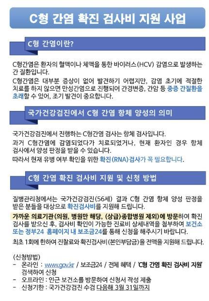 C형 간염 확진검사비 지원사업은 2025년부터 56세 국가건강검진에 C형간염 항체검사가 도입됨에 따라 검진 효과 제고 및 치료 유도를 위함이며, 국가건강검진에서 발견된 항체 양성자가 확진검사 (RNA)를 받은 경우 해당 검사 비용을 사후 환급해주는 사업이다.
