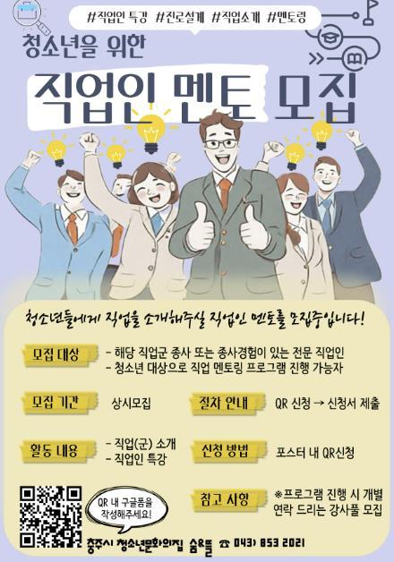 [노년신문, 성수목기자] 충주시 청소년문화의집 숨·뜰(관장 고미숙, 이하 숨·뜰)이 청소년들의 진로 고민을 해결하고 미래 설계를 지원하기 위해 2025년 상반기 직업인 멘토를 모집한다.