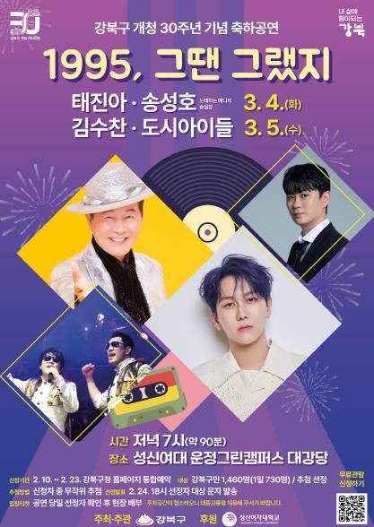 [노년신문, 성수목기자] 서울 강북구가 개청 30주년을 맞아 오는 3월 4일(화)과 5일(수), 성신여자대학교 운정그린캠퍼스 대강당에서 개청 30주년 기념 축하공연 ‘1995, 그땐 그랬지’를 개최한다. 접수는 2월 10일(월)부터 시작한다.