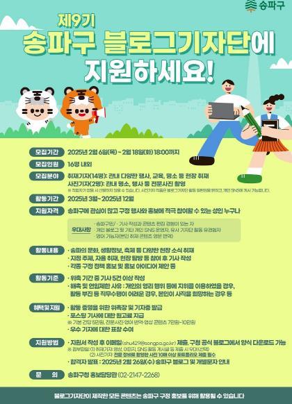 선발된 기자단은 오는 3월부터 12월까지 활동하며, 선정 기사는 송파구청 대표 블로그, 카카오톡 채널 등 SNS에 게재되고 소정의 원고료를 지급한다. 또, 우수 활동 기자에게는 표창도 수여된다.