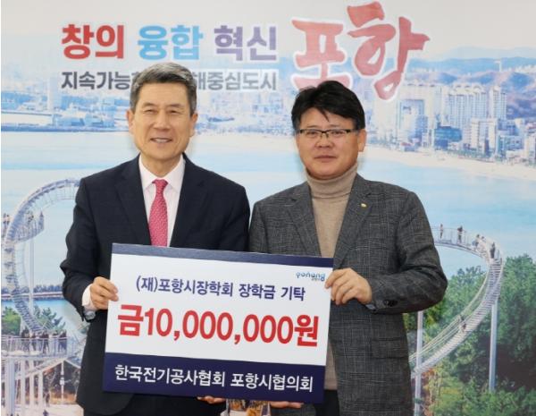 [노년신문, 성수목기자] 포항시는 한국전기공사협회 경북도회 포항시협의회(회장 김경수, ㈜신풍이엔지)가 지난 14일 포항시청을 방문해 지역 인재를 위한 장학기금 1,000만 원을 기탁했다고 밝혔다.