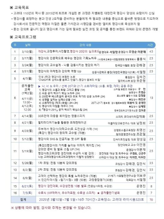 고려대학교 명강사 최고위과정은 교육 분야의 전문가와 경험이 풍부한 강사진이 참여하여, 이론과 실습을 병행한 체계적인 커리큘럼을 제공한다. 수강생들은 강의 기법, 커뮤니케이션 스킬, 교육 콘텐츠 개발 등 다양한 주제를 학습하며, 실제 강의 현장에서의 적용 능력을 키울 수 있다.