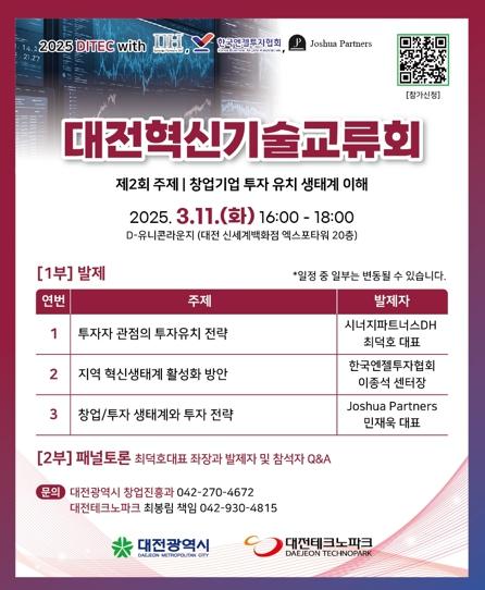 이번 교류회는 창업기업을 비롯해 스타트업과 투자에 관심 있는 시민 누구나 참여할 수 있다. 참가 신청은 네이버 폼 또는 포스터 상단 QR코드를 통해 가능하며, 자세한 사항은 대전테크노파크 기술사업화팀으로 문의하면 된다.