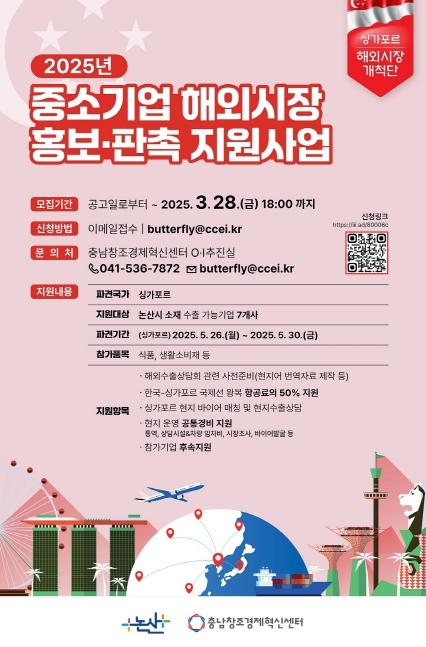 [노년신문, 성수목기자] 충남창조경제혁신센터는 2025년 중소기업 해외시장 홍보판촉 지원사업에 참여할 논산소재 수출 기업을 오는 3월 28일까지 모집한다고 밝혔다.
