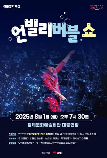 [노년신문, 성수목기자] 올여름 전 세계 100개 도시에서 감동을 선사하고, 온 가족이 함께 즐길 수 있는 특별한 공연 '언빌리버블 쇼'가 오는 8월 1일 오후 7시 30분 김제문화예술회관 대공연장에서 펼쳐진다.
