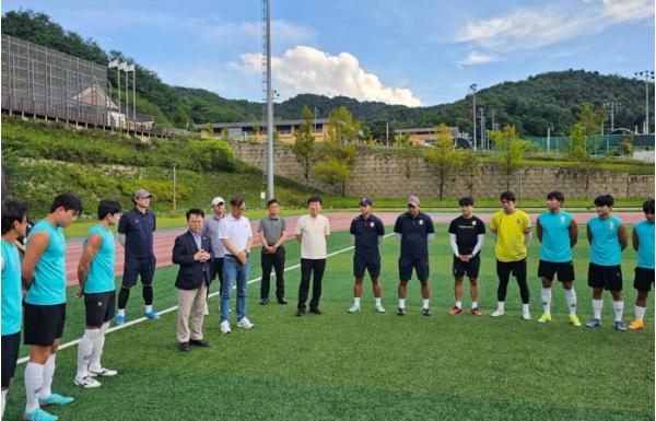 육 시장은 훈련장을 찾아 선수들의 훈련을 지켜보고 일일이 인사를 나누며 구단의 발전 방향에 대해 의견을 나눴다.