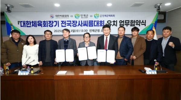 [노년신문, 성수목기자] 인제군과 대한씨름협회, 인제군체육회가 12월 3일 ‘대한체육회장기 전국장사씨름대회’ 유치를 위한 업무협약을 체결했다.