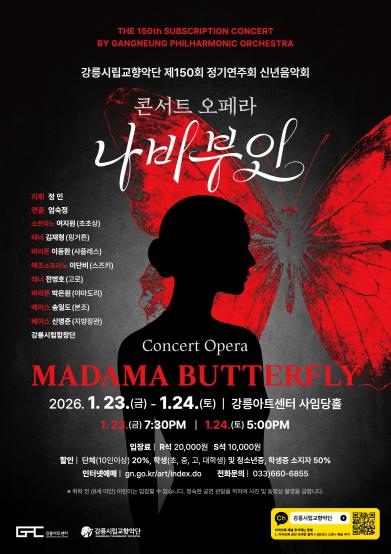 [노년신문, 성수목기자] 강릉시립교향악단은 2026년의 첫 정기연주회로 오는 23일(금) 19시 30분, 24일(토) 17시 강릉아트센터 사임당홀에서 콘서트 오페라‘나비부인’을 선보인다.